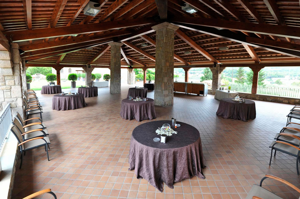 Després farem l'aperitiu en aquesta zona de porxos amb vistes a Sant Miquel del Fai i a les oliveres que envolten la masia.
